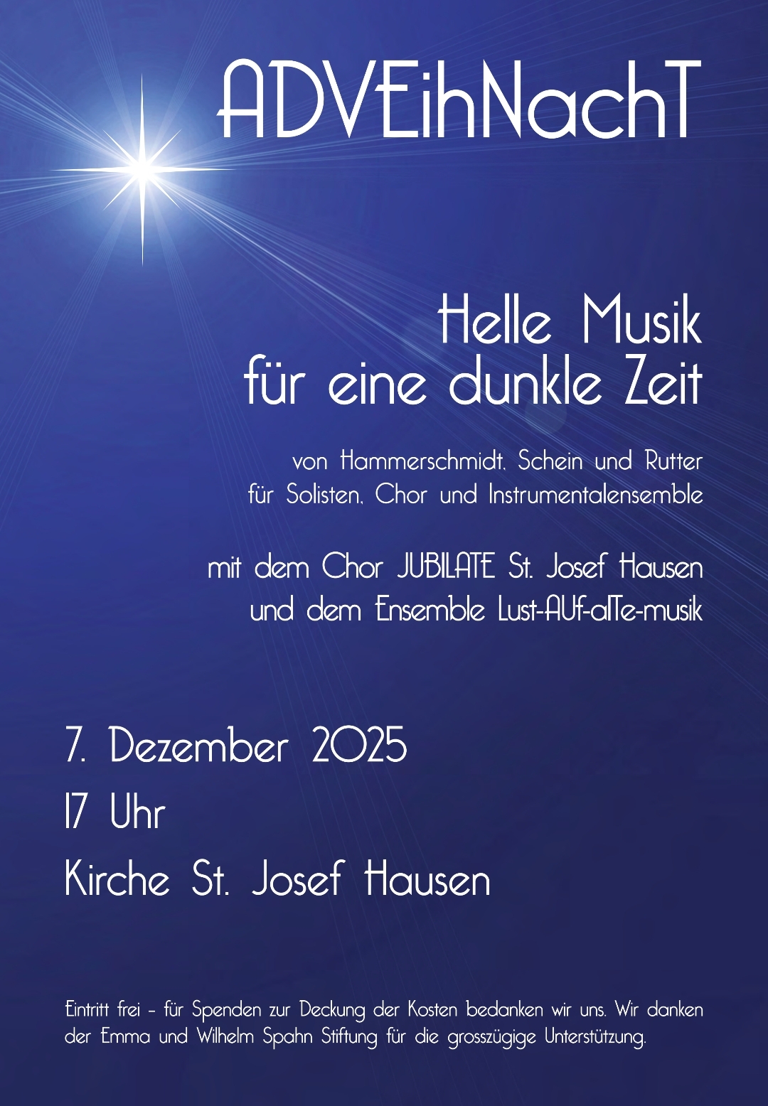 Der Chor JUBILATE St. Josef in Hausen möchte dieses Jahr Weihnachtsmusik aus zwei Welten aufeinandertreffen lassen: Die warmen Weihnachtslieder des weltbekannten Engländers John Rutter (um 2000) mit den hellen Kantaten deutscher Musiker aus dem dunklen Jahrhundert des Dreissigjährigen Krieges (um 1650) ......
